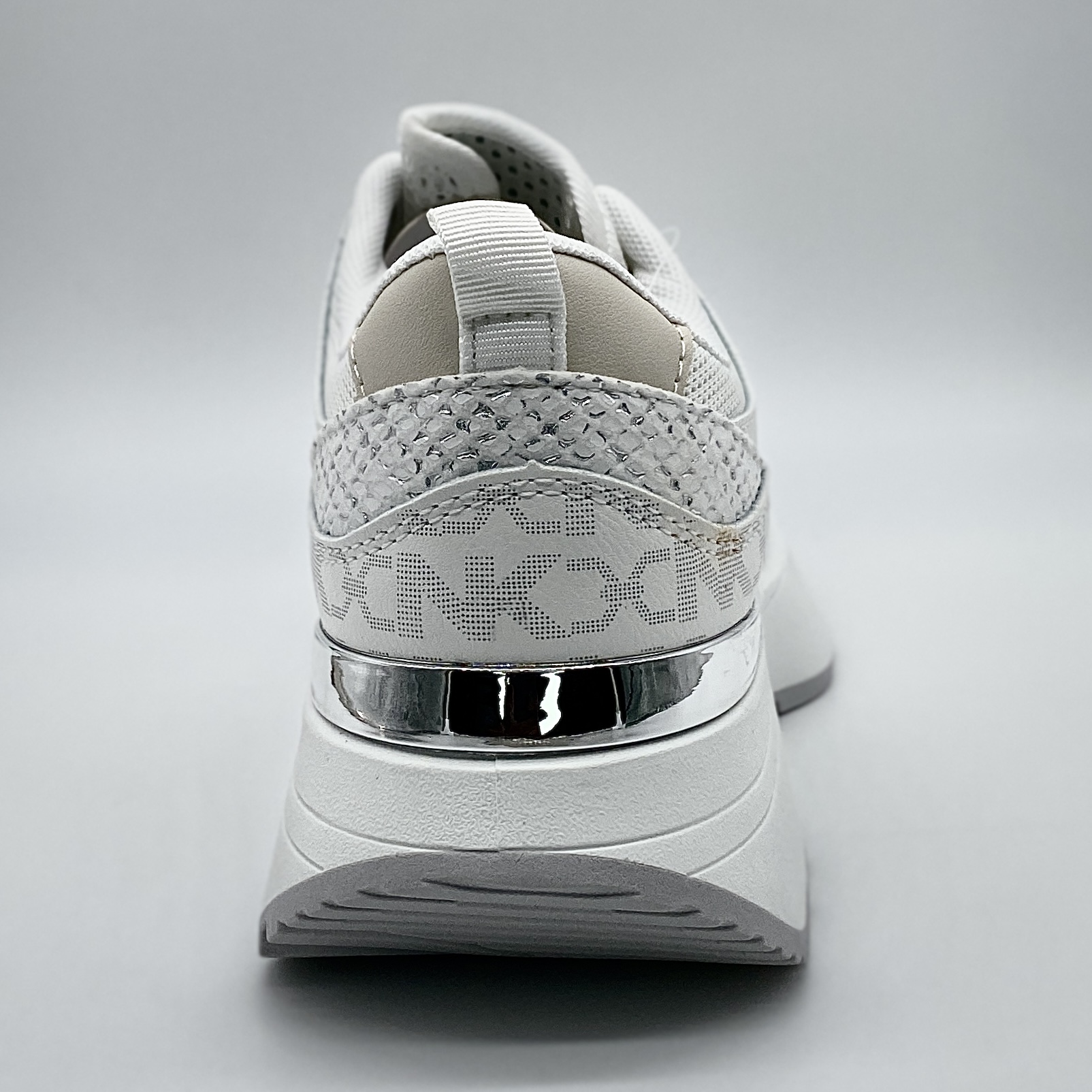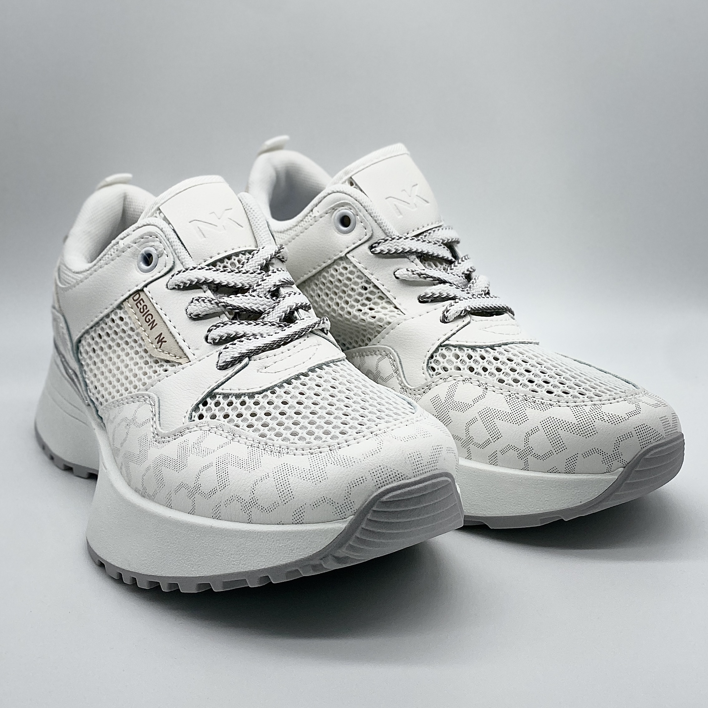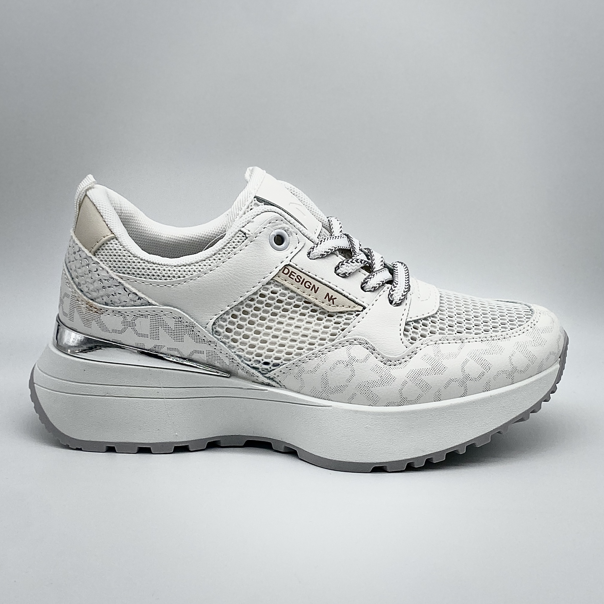 Zapatillas de mujer en color blanco con un diseño moderno y actual, perfectas para salir y para el día a día. Su suela ancha aporta comodidad y estilo, mientras que el detalle en plata en la parte trasera le da un toque diferente.