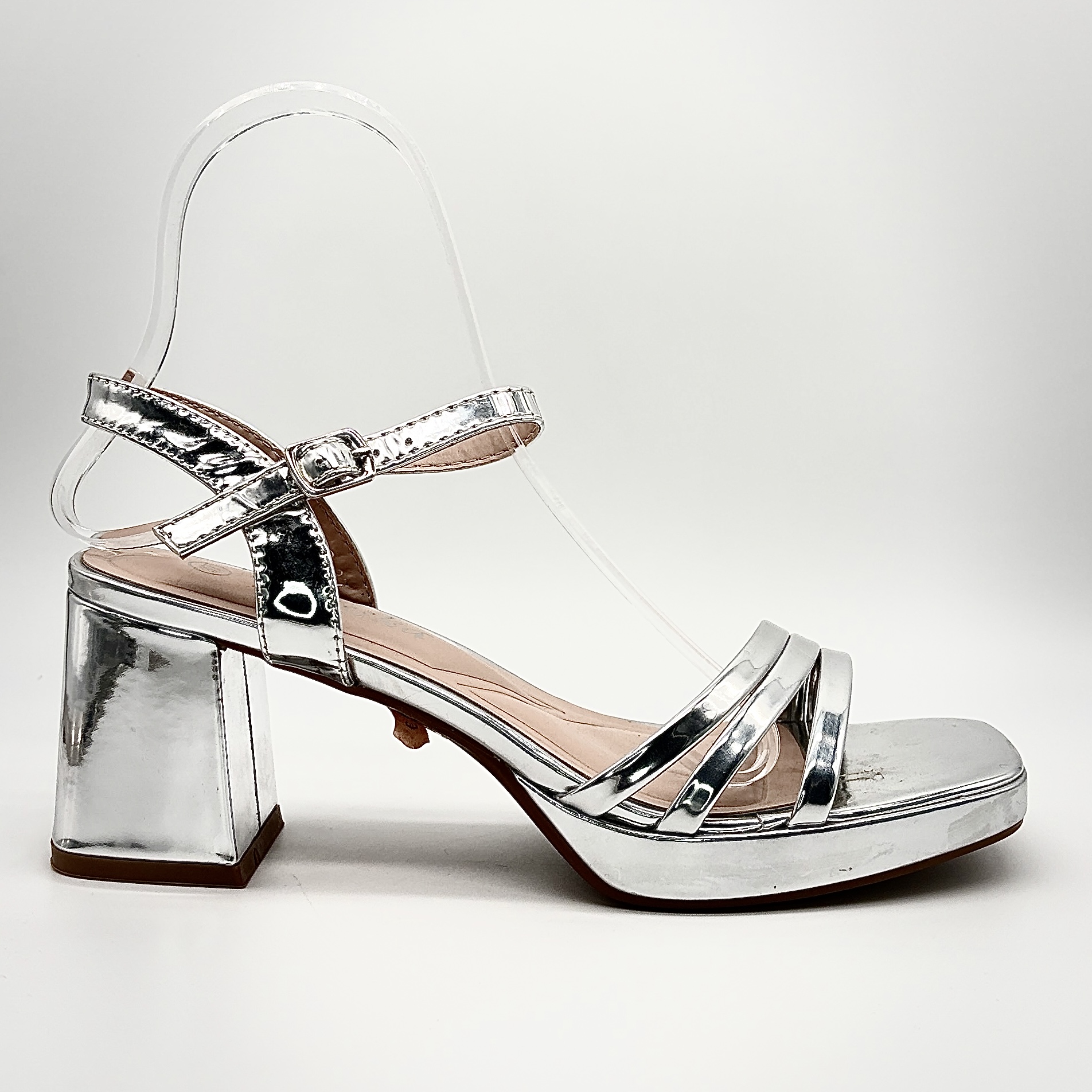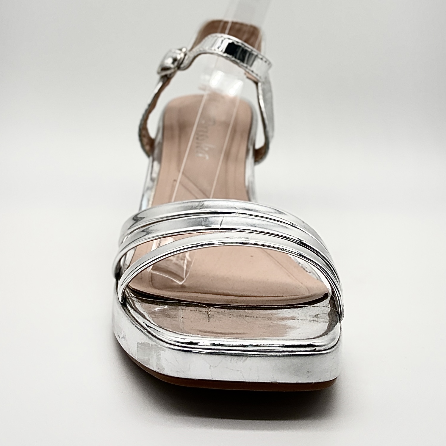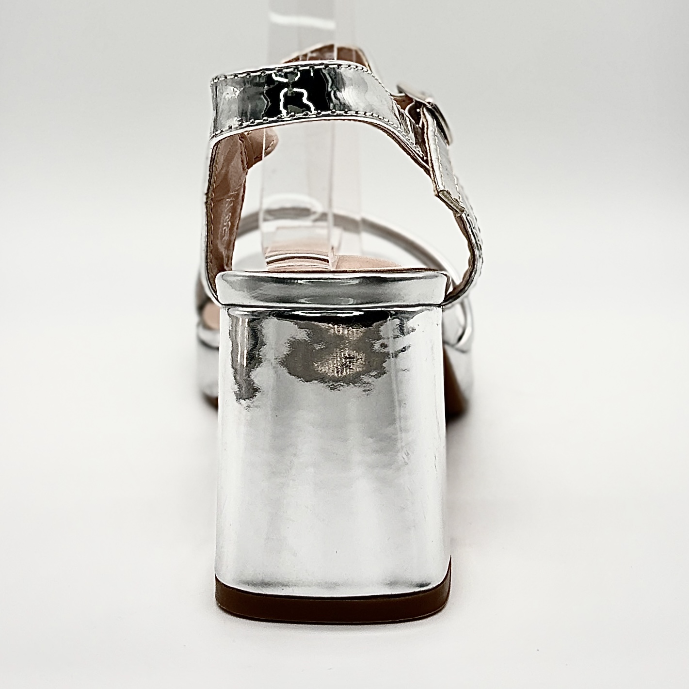 Sandalias de fiesta en color plata con tacón ancho y bajo, ideales para disfrutar de cualquier evento con estilo y comodidad. Su diseño con tiras delanteras las hace muy elegantes y fáciles de combinar.