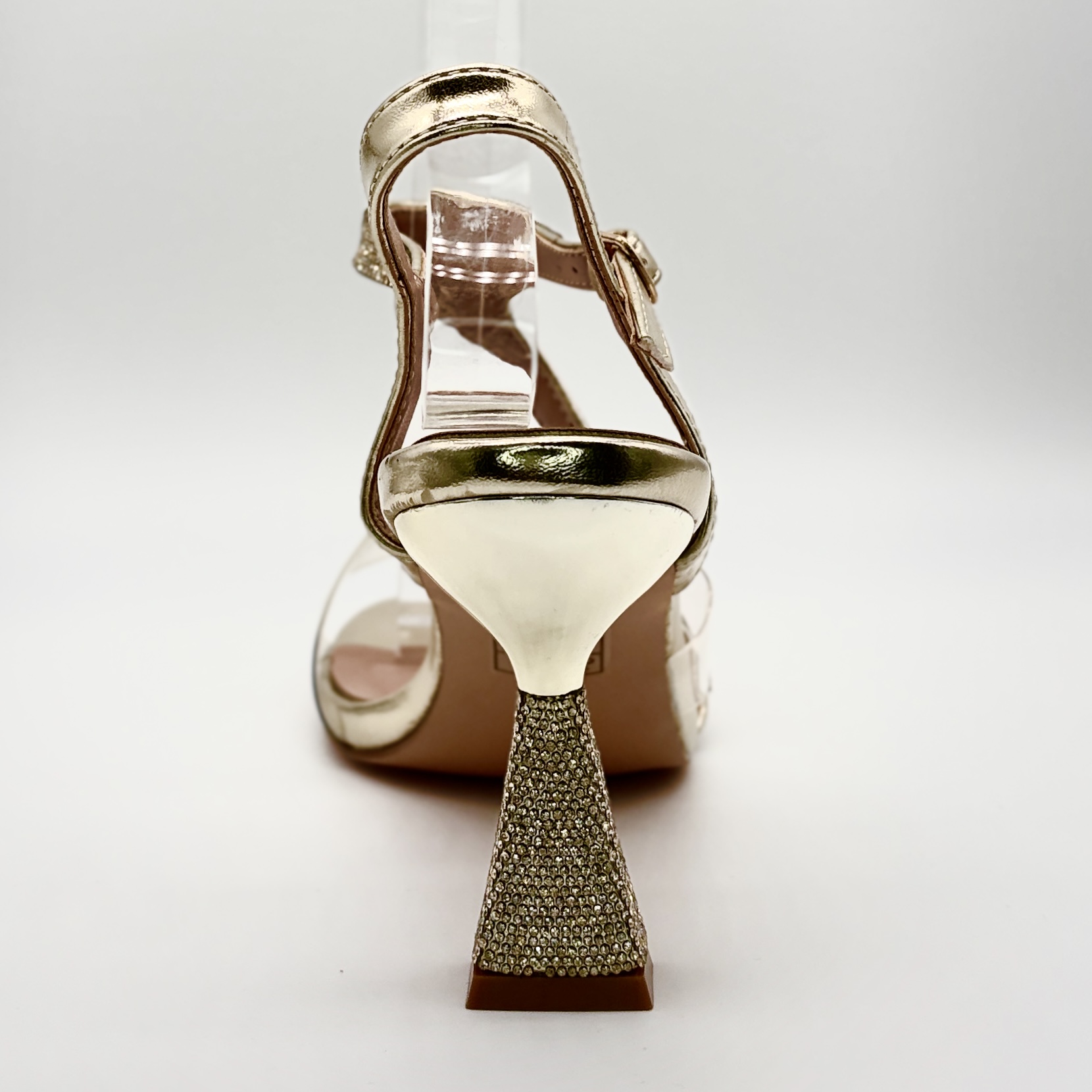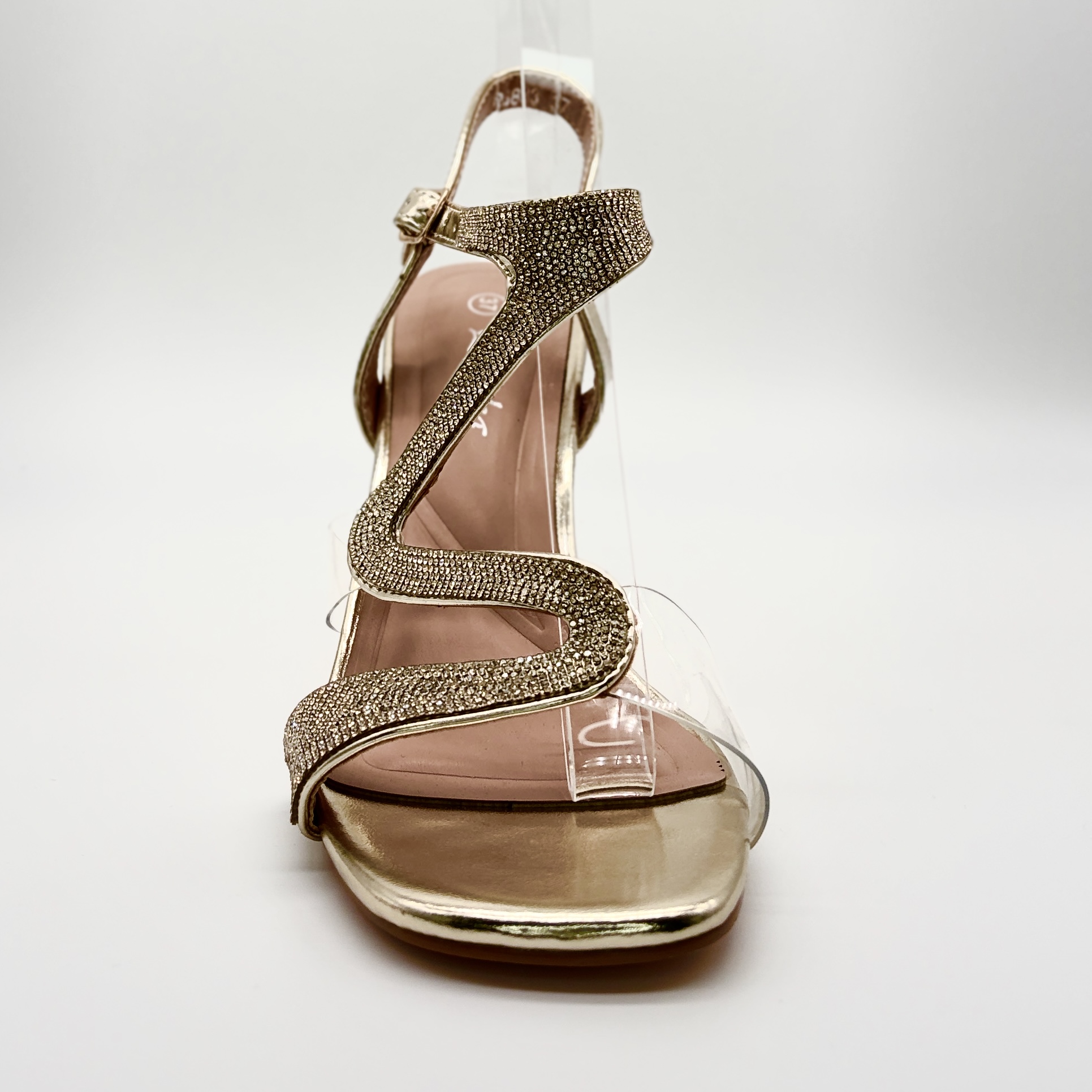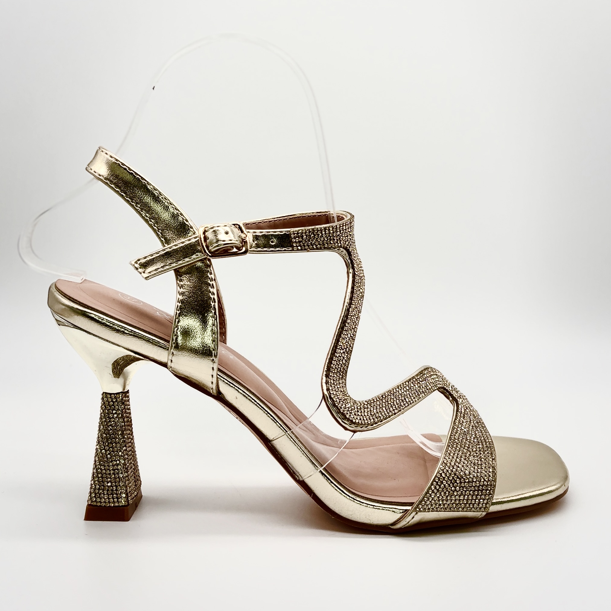 Sandalias elegantes en color dorado, perfectas para bodas y eventos especiales. Su diseño con detalle tipo serpiente y perlas las convierte en un modelo muy sofisticado y llamativo.